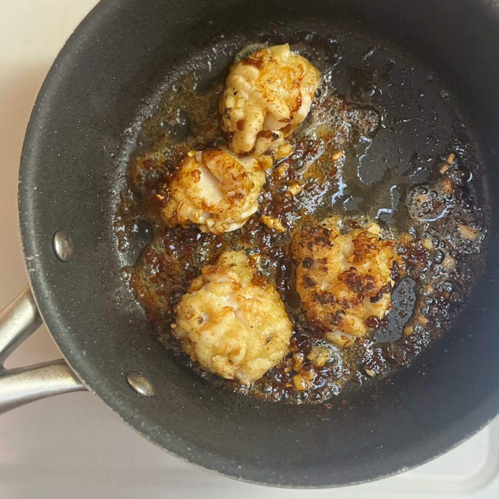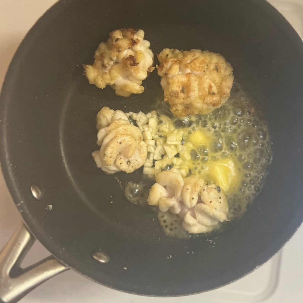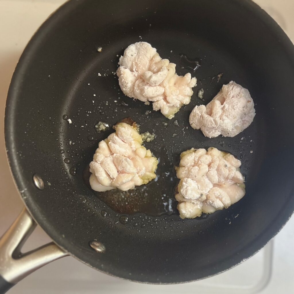 ④両面焼き色がついてきたら、白ワイン、にんにく、バターを加える。