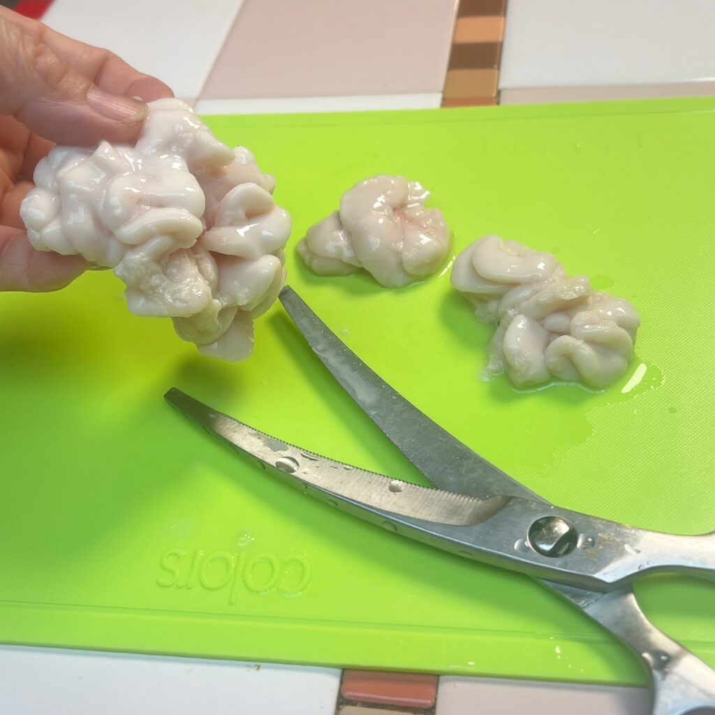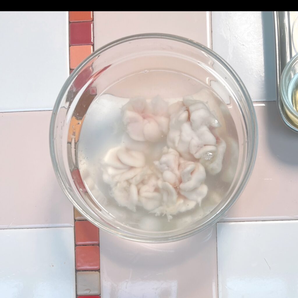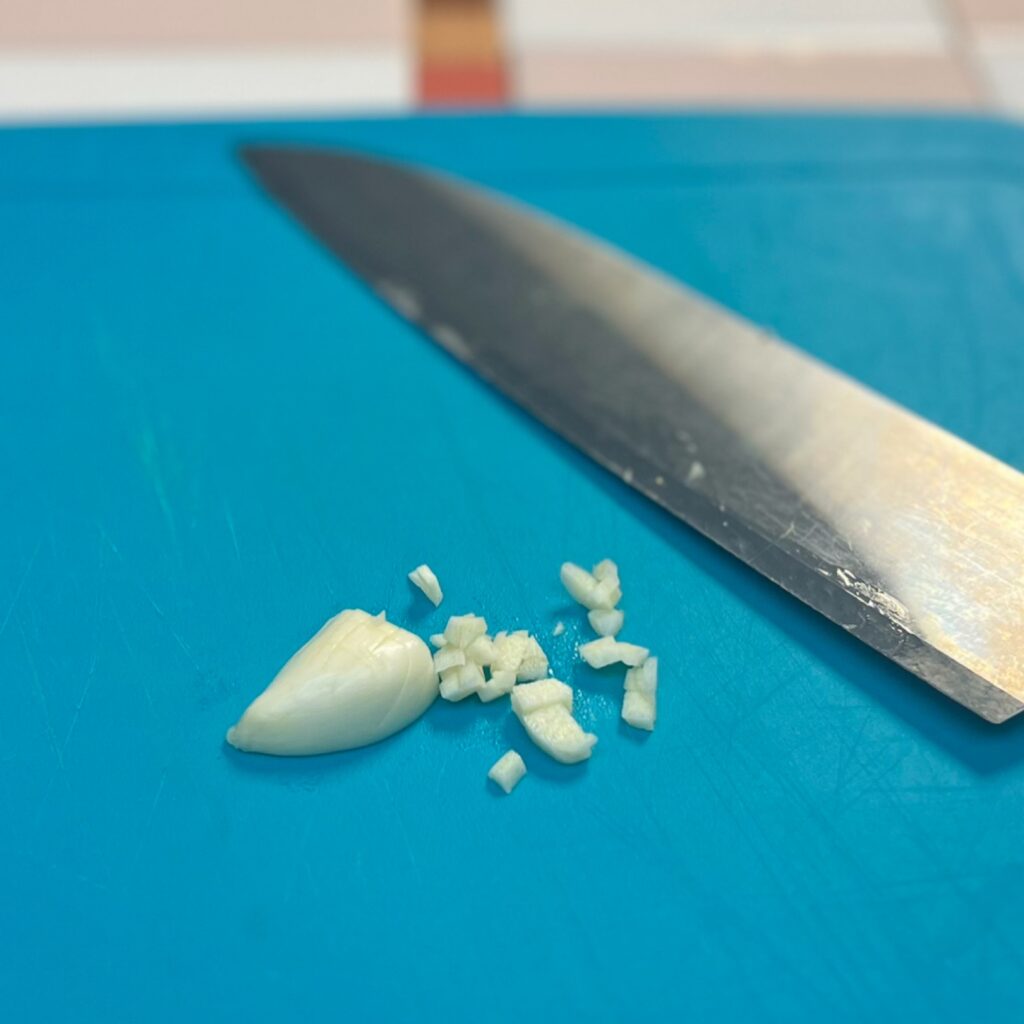 ①白子は食べやすい大きさに切って、さっと洗い、塩水に浸す。にんにくは粗みじんに切る。