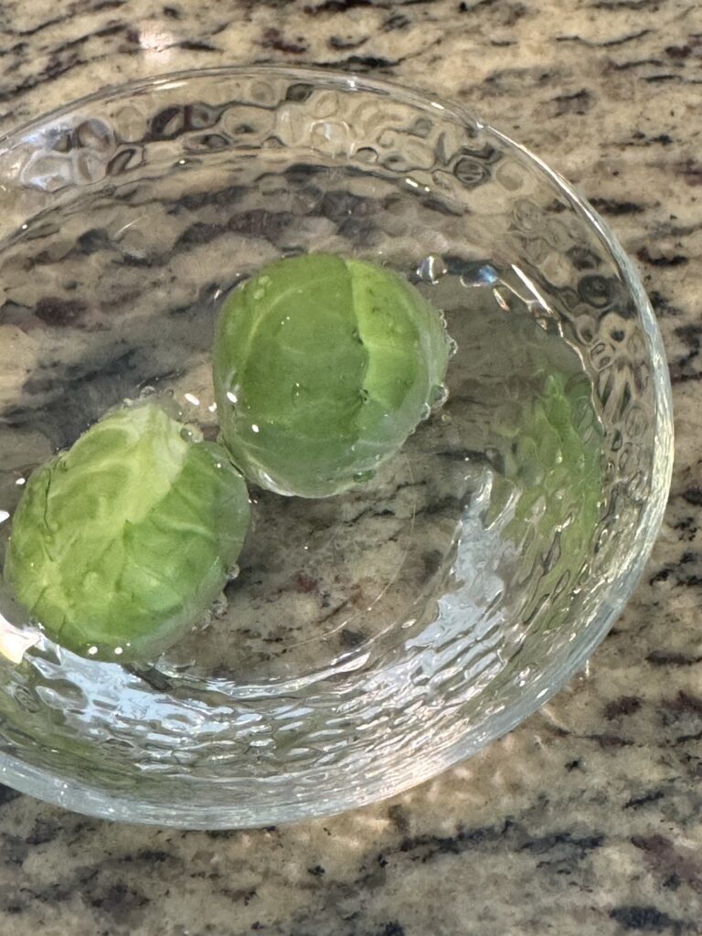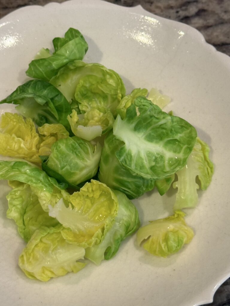 ② 芽キャベツは器に水を張り、レンジで一分半火を通し、葉をバラす