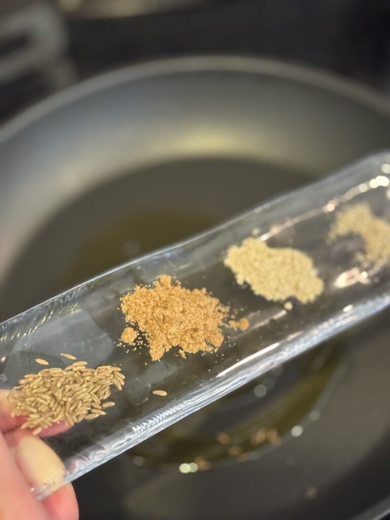 ③ フライパンにオリーブオイルを熱し、クミンシード、コリアンダー、カルダモン、ブラックペッパーを炒め、香りが出てきたら1の牡蠣を加えさっと火を通し、火を止める。