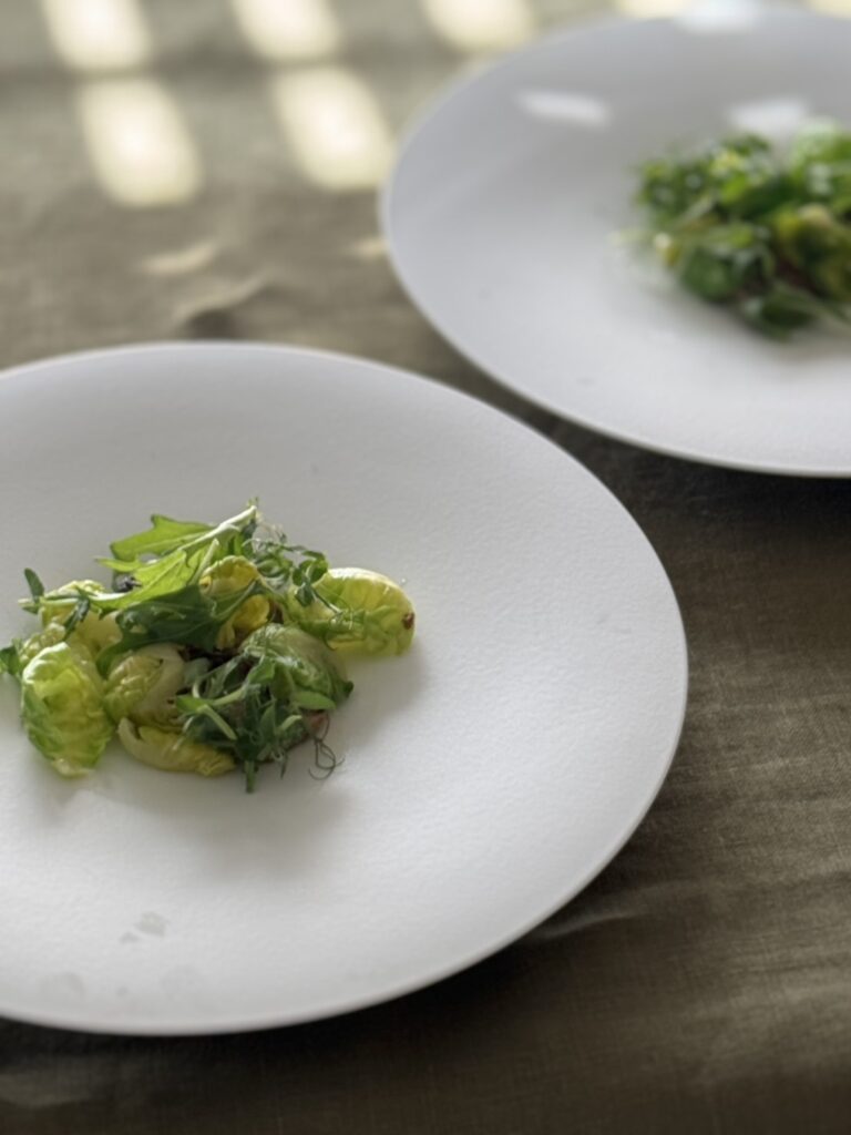 ④ 器に3の牡蠣、2の芽キャベツ、ベビーリーフを盛り付け、塩を少々ふり、お好みでトリュフオイルをかける