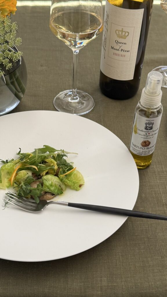 ソーヴィニヨン・ブランの柑橘やハーブのニュアンスが芽キャベツやスパイスと調和し、セミヨンのやわらかなコクが牡蠣の旨味をやさしく包み込みます。