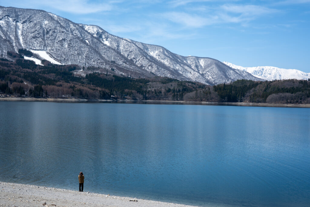 まだ雪の残る山々に囲まれた景色は、まるでノルウェーのようだ。ひとり、水面の近くまで降りてみる。とても静かだ。