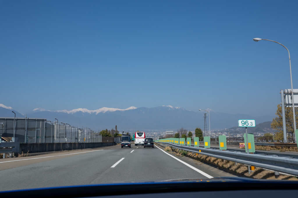 誰かが叫ぶと、美しく冠雪した富士山が左手に見えてきた。気持ちが浮き立つ。この車にはスポーツモードがついている。切り替えると、まるで別の車のようなエンジン音が響いてきた。一気に加速する。静かで上品なセダンが、唸りを上げながら駆ける狼に変わる。 目の前に甲府盆地が広がり、南アルプスの山々がそびえているのが見えてきた。中央高速で、日常から旅の気分に一気に切り替わる瞬間だ。