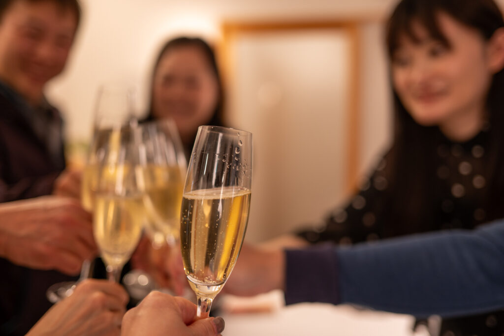 抜栓し、皆のグラスに注いだ。きらきらと金色の泡が立ち上る。