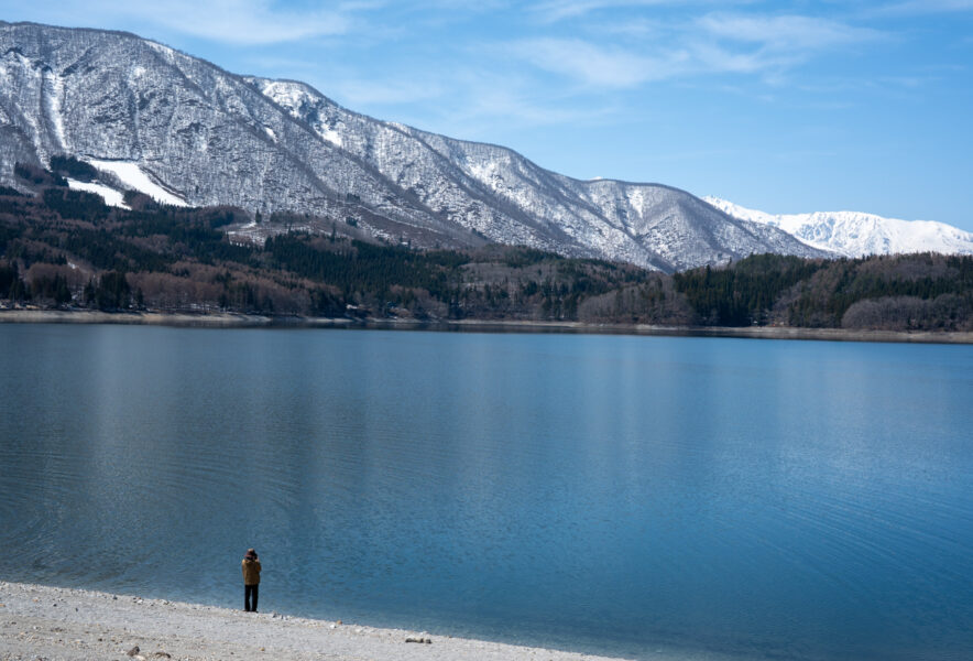まだ雪の残る山々に囲まれた景色は、まるでノルウェーのようだ。ひとり、水面の近くまで降りてみる。とても静かだ。