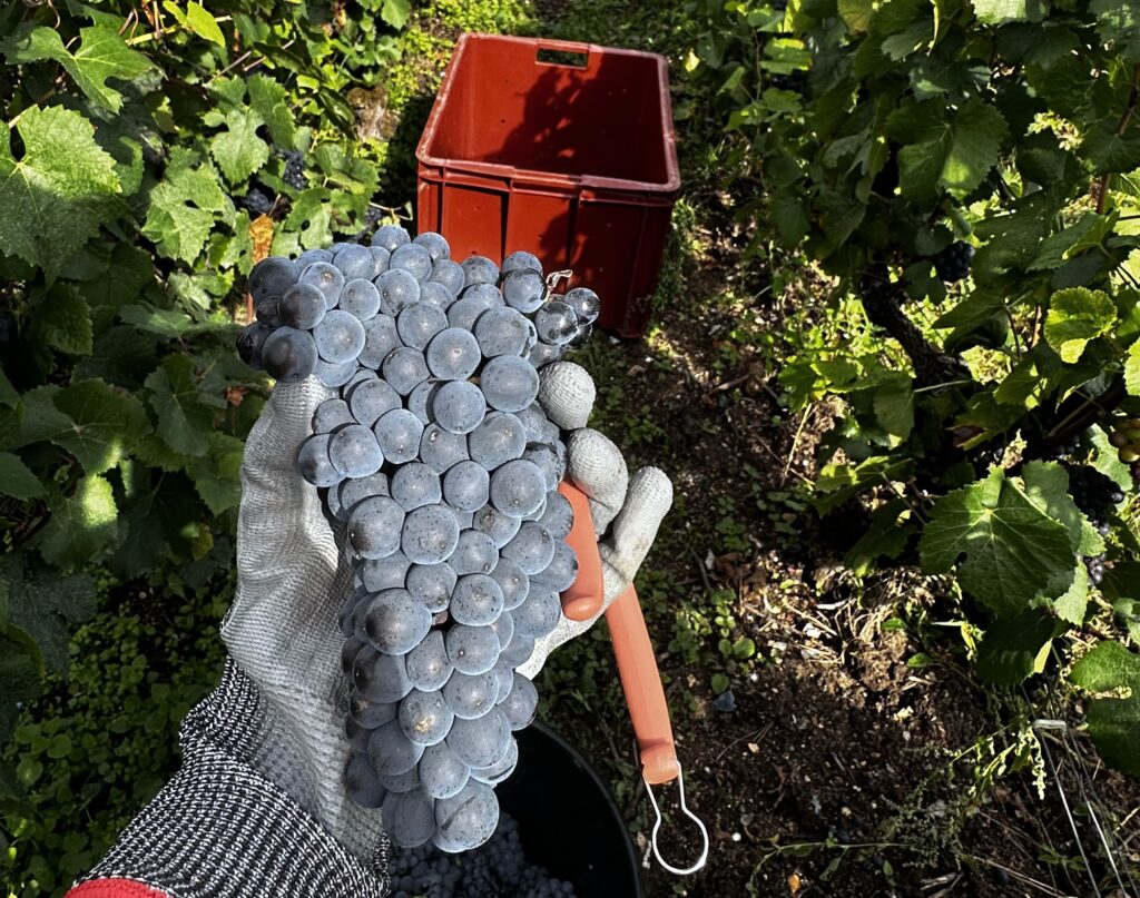 朝、事前に配られたボランジェのTシャツと帽子を身に着け、トーシエール・ミュトリー(Tauxièrers-Mutry)村にあるボランジェの畑に集合。まずは栽培責任者のガエルさんの説明を聞いて、世界各地から集まったシャンパーニュ専門家の皆さんと、ピノ・ノワールのブドウを収穫しました。トーシエールはモンターニュ・ド・ランス地区とヴァレ・ド・ラ・マルヌ地区が交差する場所にある一級格付けの村で、ボランジェのワイン造りにおいて、中核となるクリュ(村)の一つ。ボランジェはここに18ヘクタールの畑を所有しています。これらは、現オーナーファミリーが1900年前半に購入したもので、ファミリーとの縁が深い場所。私たちが収穫を手伝った翌日は、毎年の恒例行事として、ファミリー20数名が集まり収穫をしたそう。