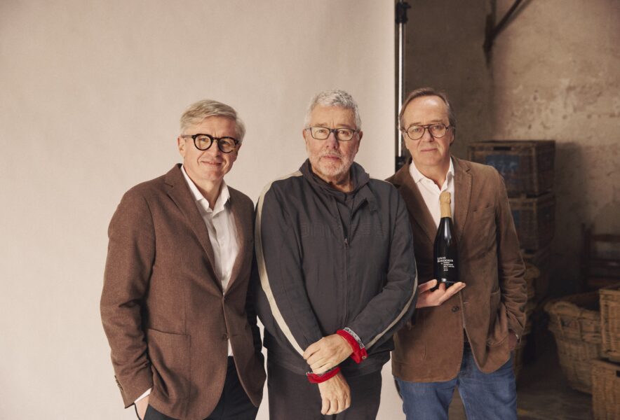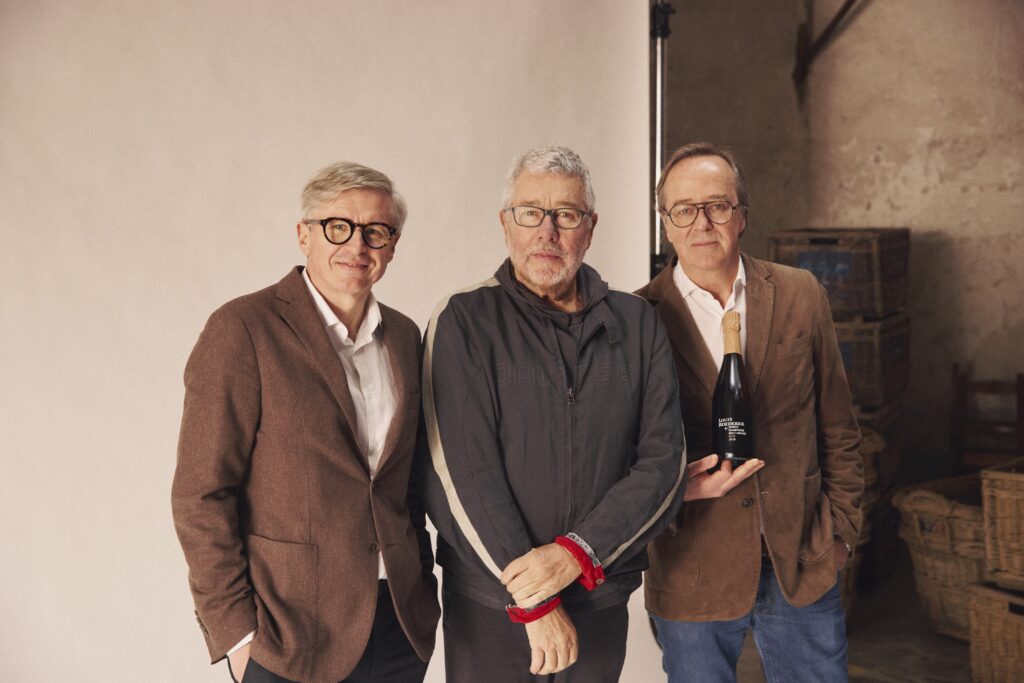3人のアイデアが集結し「ブリュット・ナチュール」が造られた。左から、ジャン・バティスト・レカイヨン(Jean-Baptiste Lécaillon)、デザイナーのフィリップ・スタルク(Philippe Starck)、CEOのフレデリック・ルゾー(Frédéric Rouzaud)