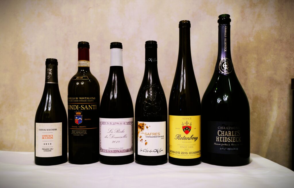 画像右から「シャンパーニュ シャルル・エドシック/ブリュット レゼルヴ マグナム」「ドメーヌ・ツィント・フンブレヒト/ピノ・グリ ローテンベルグ 2021」「ル・クロ・デュ・カイユ/シャトーヌフ・デュ・パプ ルージュ レ・サフル 2021」「ルイ・ジャド/ラ・ロッシュ・デ・ドゥモワゼル 2018」「ビオンディ・サンティ/ブルネッロ・ディ・モンタルチーノ 2018」「シャトー・スーシュリー/コトー・デュ・レイヨン プルミエ・クリュ ショーム 2018」と、日本リカーの代表格のファインワイン