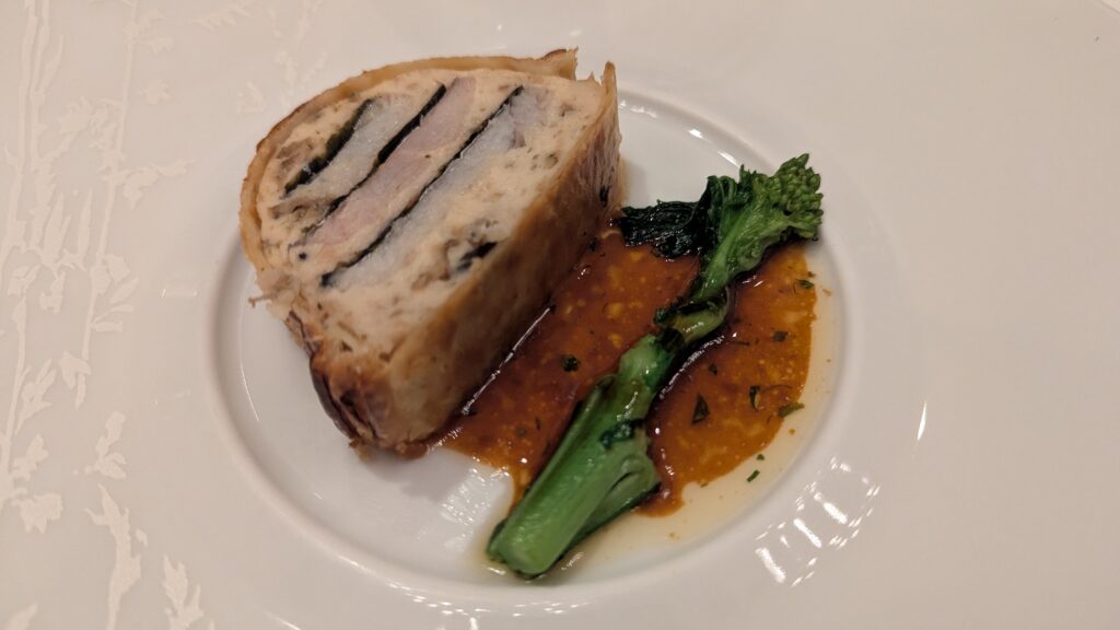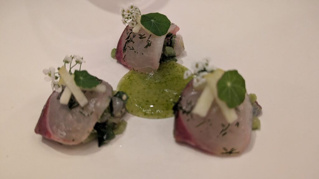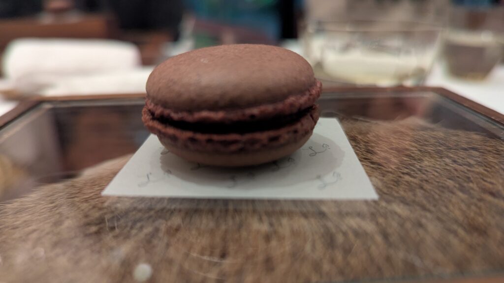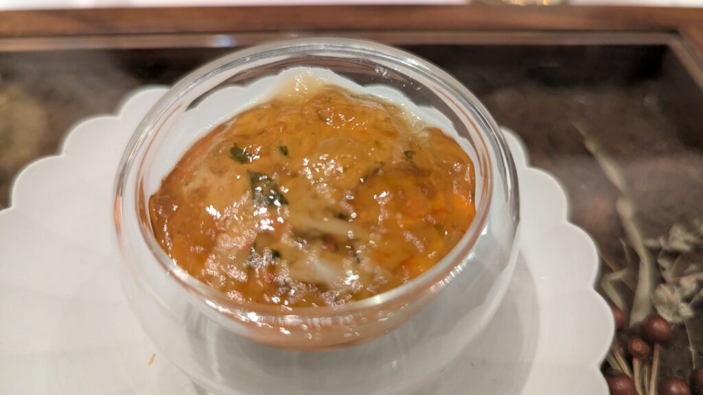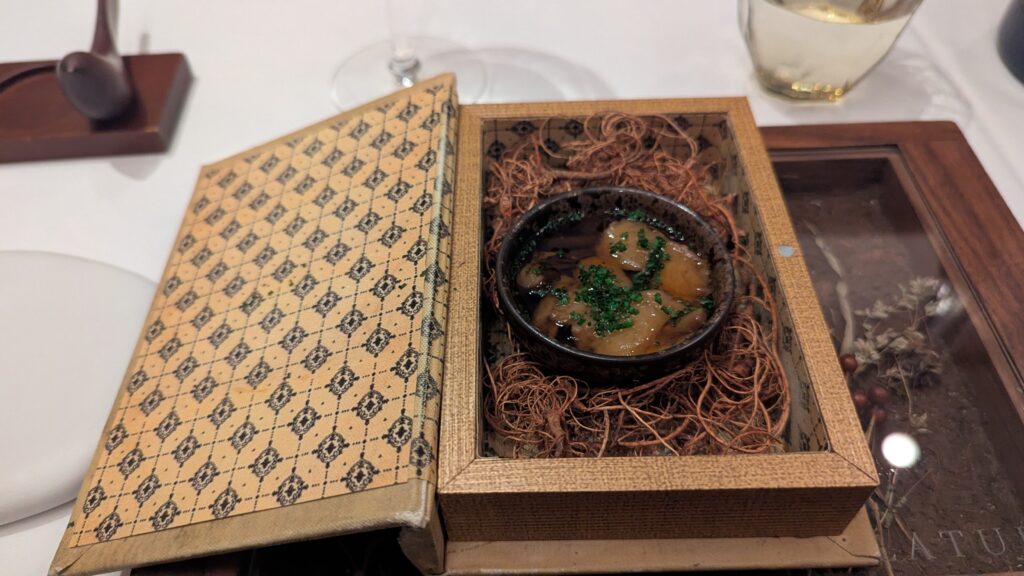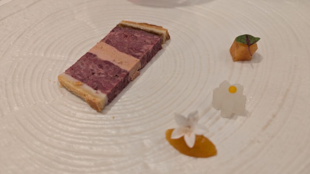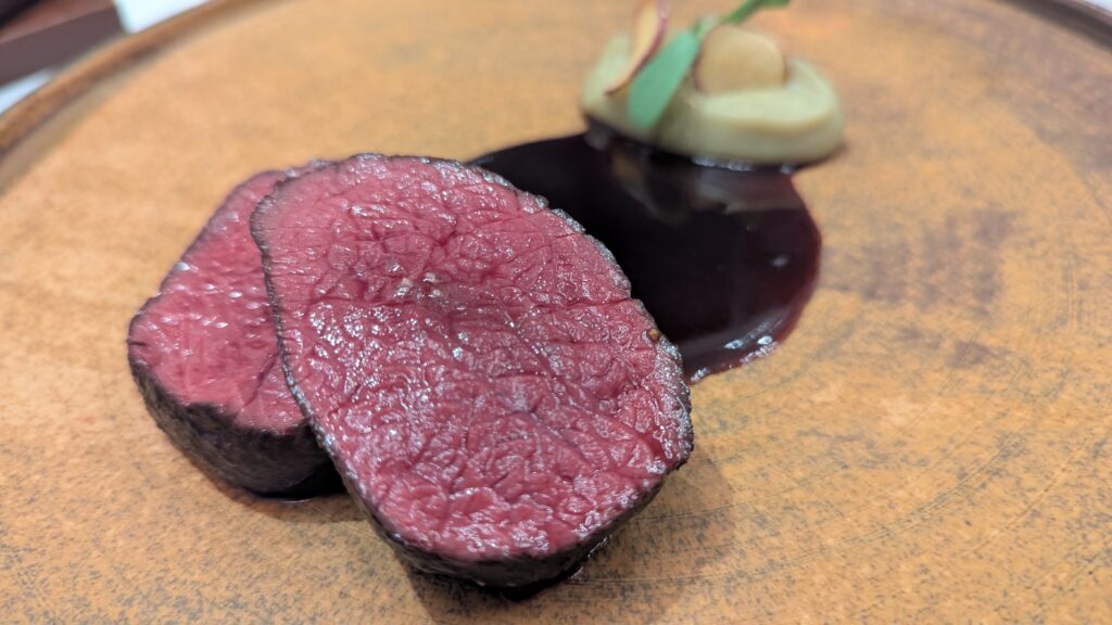 料理は、鹿ブラッドマカロンから始まるLATUREらしい鮮烈な構成。シマアジのマリネにはツィント・フンブレヒトのピノ・グリの奥行きが寄り添い、ジビエパテアンクルートにはレ・サフルのスパイスと温度感が美しく響く。太刀魚と牡蠣のパイ包みには、ジャドのドゥモワゼルが見事なまでの立体感を与え、蝦夷鹿のローストにはビオンディ・サンティの2018が“気品のある野性味”という表現そのものを体現していた。