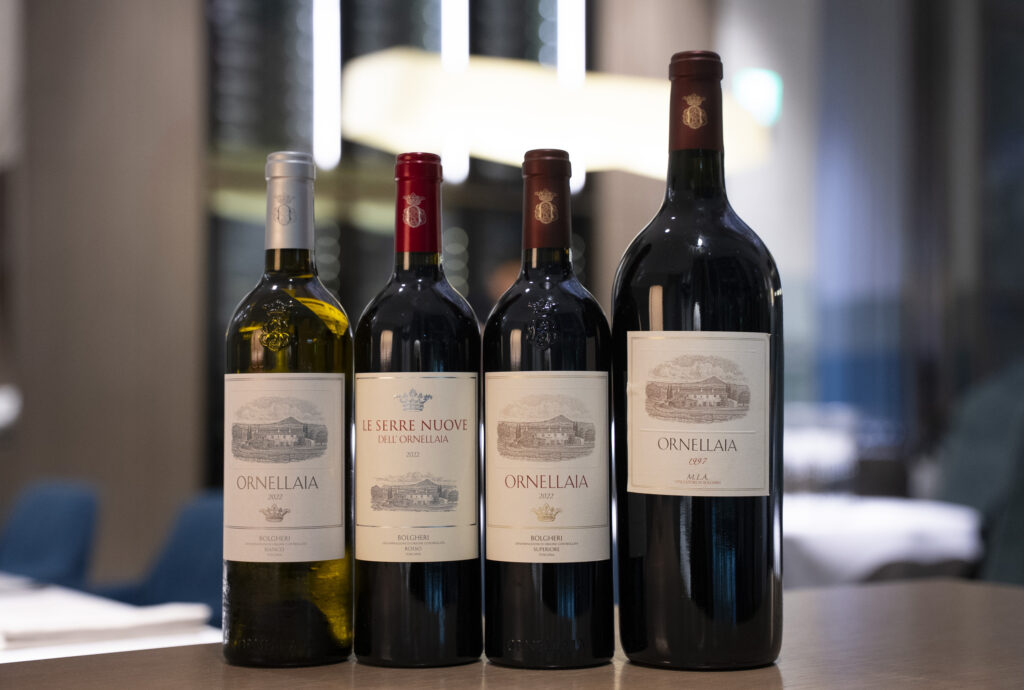 一番左のオルネッライアは……まさかの白? ソービニヨン・ブラン100%のオルネッライア・ビアンコ2022年は、わずか10ケースのみ日本へ輸入。出会えた人は相当ラッキーだ。
